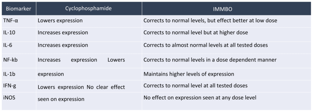 - Cyclophosphamide is an immunosuppressant that can either reduce or elevate cytokine biomarkers. IMMBO helps restore these levels toward normal.
